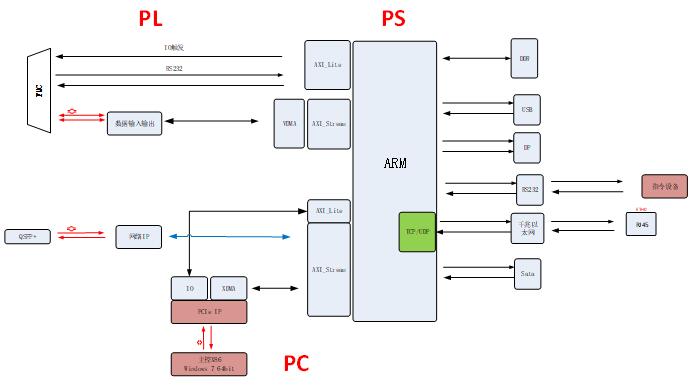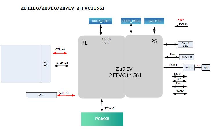 1、板卡核心芯片使用ZU11EG-2FFVC1156I MPSOC处理器,PL端一路DDR4 64bit,4GB容量;PS端一路DDR4 64bit,4GB容量;支持EMMC、QSPI Flash、 SD卡加载; 2、板内PL支持1个标准FMC HPC接口,支持8个GTH,LA,HA,HB,I2C信号。 3、板内PL支持1路QSFP+ 光纤; 4、板内PS支持1路mSATA硬盘,支持2TB容量存储; 5、板内PS支持1路千兆网络,1路调试RS232; 6、板卡PS支持1路I2C总线,连接加密E2POM,和板卡测温芯片; 7、板卡PS支持USB3.0,DP显示接口 8、板卡PS支持Can,IO,Uart,SPI接口 9、板卡+12V供电,支持工业级芯片,满足-25℃到+65℃工作。三、板卡软件 板卡支持 Vivado 2018.3软件开发,完成接口软件测试,Linux操作系统移植和上位机Demo软件开发。实现PS,PL各路接口测试,目前完成PCIe功能开发,千兆网,万兆网的开发,FMC接口匹配公司视频,AD类子卡,有充分的接口互联软件,基础软件功能免费提供,高端软件及复杂软件进行定制。 软件结构: