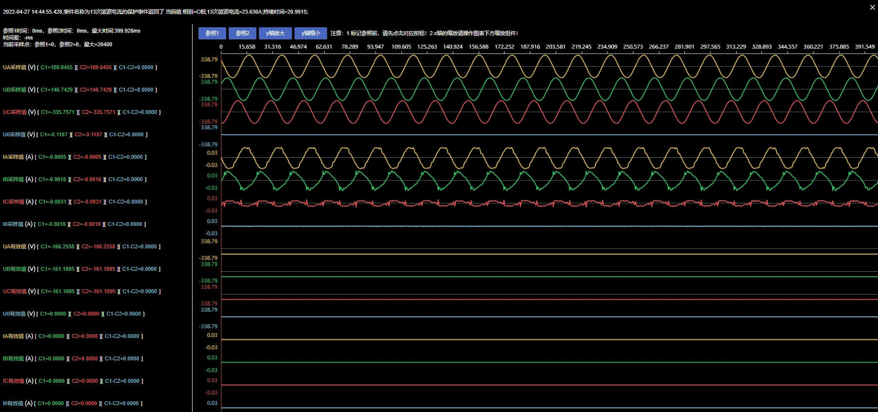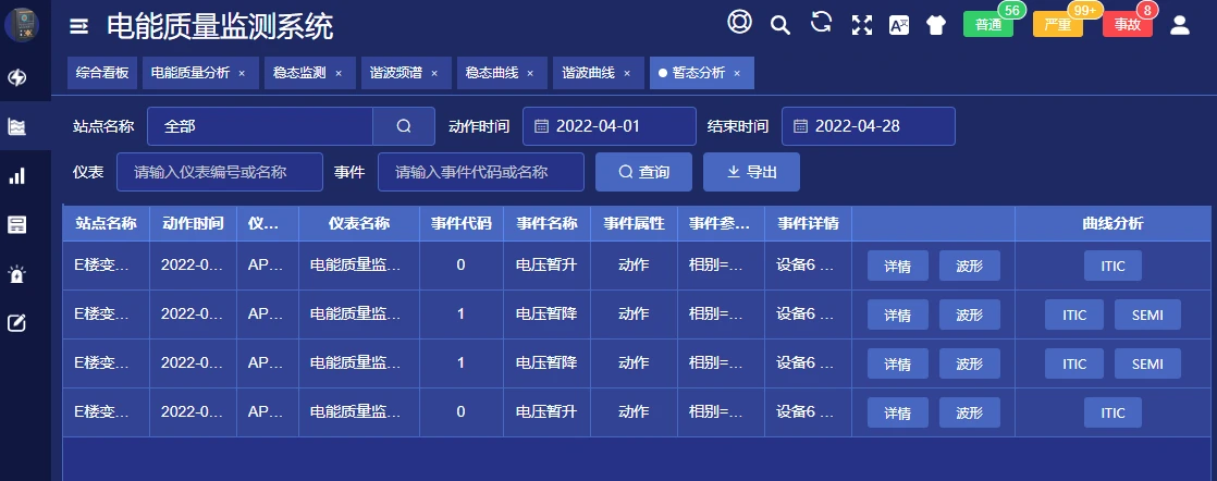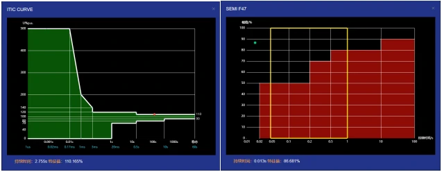 对于电压暂升、暂降及短时中断事件可为用户提供ITIC/SEMIF47容忍度曲线分析,用户也可查看发生告警的事件波形,波形精度为每周波1024点。