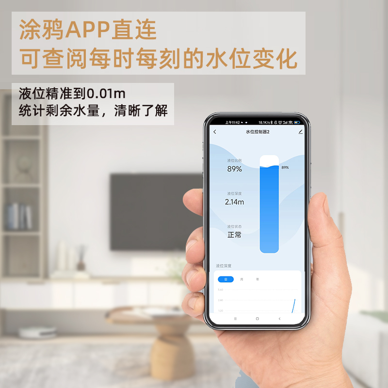 我们的超声波液位传感器可以实时检测液位情况,并通过手机实时查看。它可以观测到三种液位状态,包括正常、上限报警和下限报警,并且可以设置液位报警提醒。当液位达到上限时,手机APP会发送通知提醒,操作非常简单。传感器的有效探测距离为10cm到250cm,需要安装在水箱底部开孔处。手机上的涂鸦APP会根据实际液位变化而变化,当液位达到0.36m时,会出现上限报警提醒,当液位下降时,会恢复正常。上限和下限都可以由客户自由设置,以满足客户随时随地查看液位情况的需求,只需轻触手机即可查看液位情况。