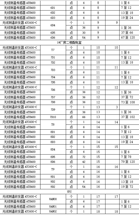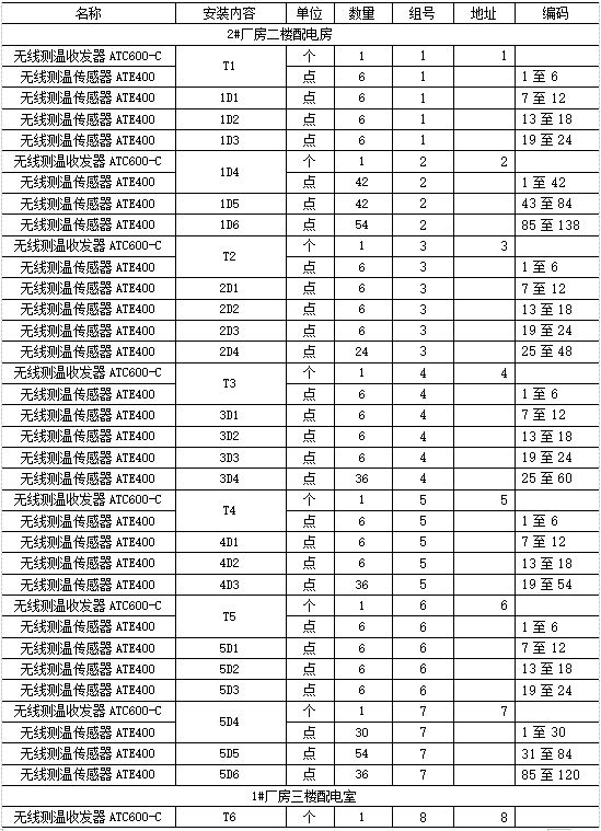 本项目使用无线无源测温传感器共计1200只,无线测温收发器共计18只。详细配置方案和安装情况如下表。