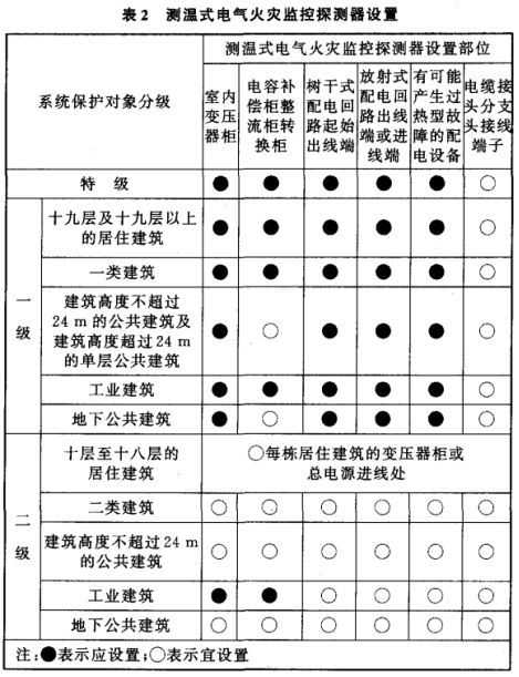 被探测对象为绝缘体、或金属壳体已可靠接地时宜将探测器的测温探头直接固定在被探测对象的表面,采用接触式布置。也可间垫云母绝缘片固定在导电体表面。探测配电柜内部温度变化时,测温探头可采用非接触式布置,但应尽量靠近发热部件测温式电气火灾监控探测器设置部位见表2
