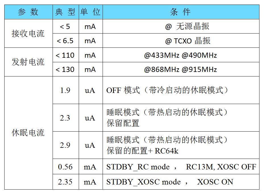 从上表可以看出,LoRaCC68 无线收发模块中发射电流受工作频率影响较大,频率越大电流越大。接收电流和晶振关系有关,接收电流(无源晶振)可小于5mA。