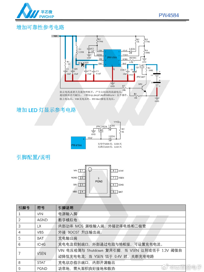 电,转换效率为90%。PW4584 输入电压为5V,内置自适应环路,可智能调节充电电流,防止拉挂
