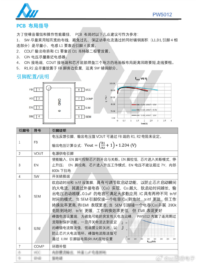 尺寸系统解决方案。PW5012 开关频率是360kHz。 工作在PWM模式,但在轻载时工作在PFM