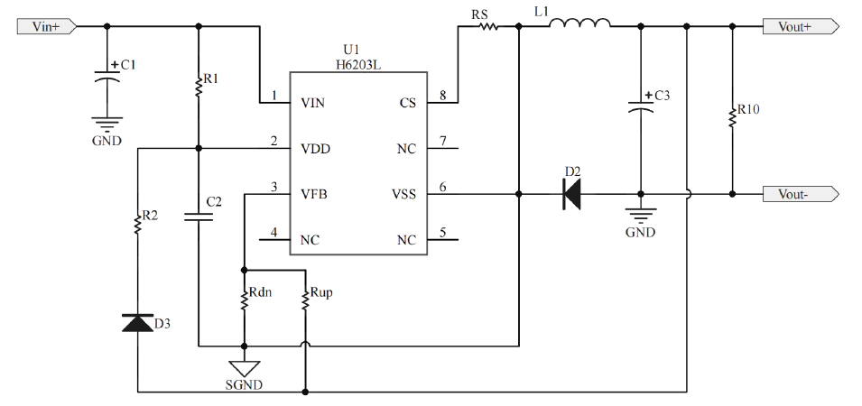 H6203L支持输出恒定电压,可以通过调节VFB采样电阻来设置输出电压,同时支持最大电流限制,可以通过修改CS采样电阻来设置输出电流最大值。典型开关频率为130KHz,设计有最小开关频率5KHz,可以确保良好的输出动态响应。在轻型负载下,H6203L将进入PWM+PFM模式,以获得较高的转换效率。
