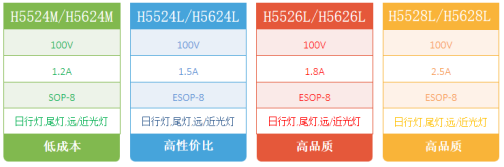 H5524M/H5624M和H5524L/H5624L,为低成本,高性价比之选,可优先适配小功率的日行灯和尾灯,对于参数不大的远/近主灯也可适用。