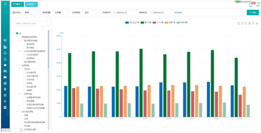 多建筑能耗对比分析:对接入平台的任意多个建筑物,按照分类能耗、分项能耗、单位面积能耗在同一时间段内进行逐时、逐日、逐月对比分析。