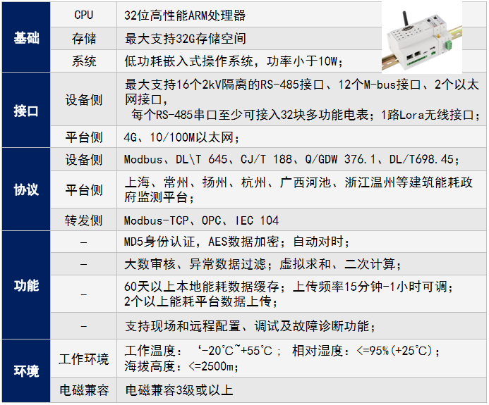 数据采集器应支持对多种类型的能源计量装置进行采集;具备向多个平台发送数据的能力;支持自动校时;支持断点续传;支持远程配置和管理;支持数据加密、身份认证;支持本地存储;
