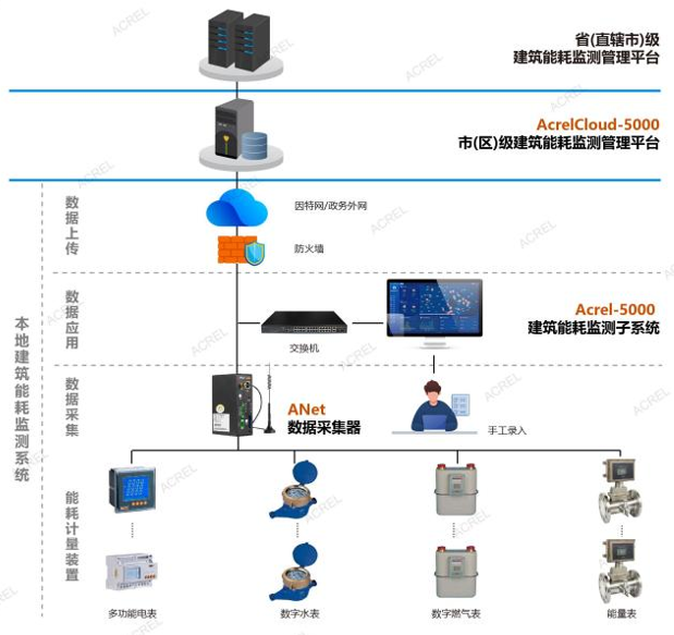 大型公共建筑能耗监测系统为三级架构:一 为省级建筑能耗监测管理平台;二 为市(或区)级建筑能耗监测管理平台;三 为建筑(建筑群)能耗监测子系统。