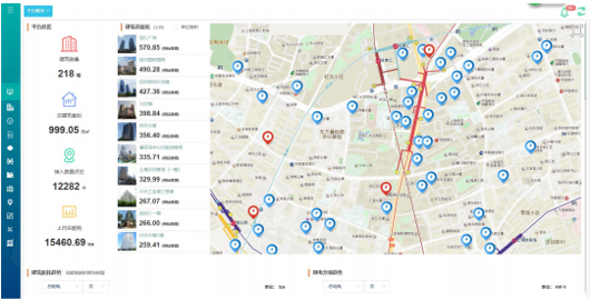 能耗综合看板:综合展示平台接入的所有建筑的能耗情况,包括接入的建筑数量、建筑总面积、总能耗,并以地图形式显示建筑物的分布情况。