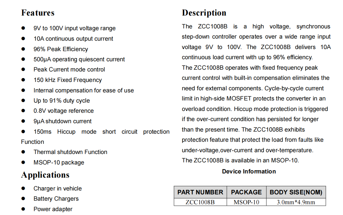 输入9-100V高耐压降压芯片,输出电流可达10A-ZCC1008B