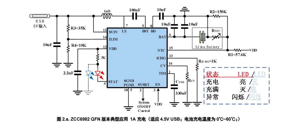 ESSOP10 封装可达到 2A)。对于不同的便携式应用,可以使用外部电阻器对充电电流进行编程。ZCC6982 具有短路(SC)、涓流(TC)、恒流(CC)和恒压(CV)四种充电过程:短路充电(SC)可对 0V的电池充电;涓流充电(TC)可涓流充电恢复完全放电的电池;恒流充电(CC)可快速的对电池充满;恒压充电(CV)可确保安全的充满电池。支持唤醒深度放电的电池。ZCC6982 充电截止电压可通过外置电阻调整,充电电流也可通过外部电阻进行设置。当充电电流降至设定值的 1/10 时,ZCC6982 将自动结束充电过程,持续检测电池电压,下降到一定阈值时自动再充电。当输入电压(USB 源或 AC 适配器)拿掉后,电池端漏电在 25uA。ZCC6982 集成充电和充满提示,以及异常指示。保护功能包括输入过压保护 (OVP)、电池 OVP、电池短路保护、热关断、电池温度监控器、可配置的定时器,以防止对没电的电池进行长时间充电。
