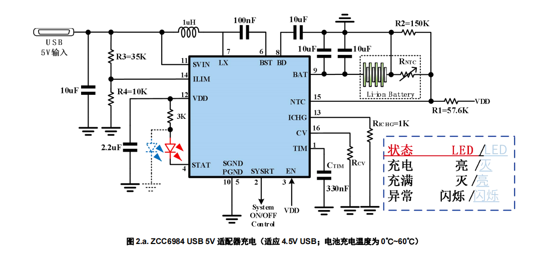 ZCC6984 具有短路(SC)、涓流(TC)、恒流(CC)和恒压(CV)四种充电过程:短路充电(SC)可对 0V