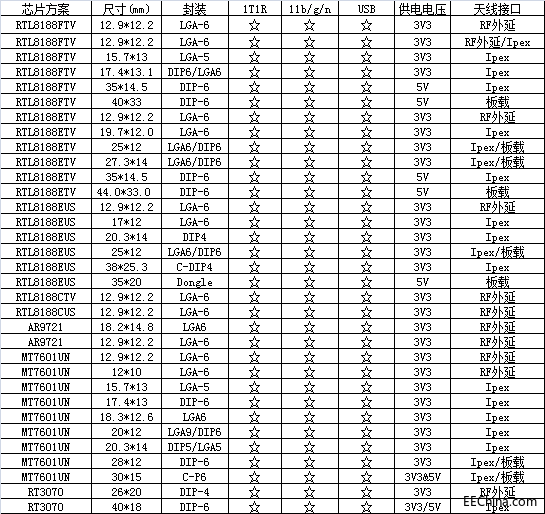 选择的芯片主要是RTL8188系列、MT7601UN、AR9271、RT3070;供电电压有3V3或5V;天线处理方式是通过模块上RF脚外延或者PCB板或者板载I-pex座子外接;还有大功率版本;以经典型的封装LGA-6、尺寸12.9*12.2mm为主,这种封装下不同品牌方案硬件安全兼容;对于一些尺寸完全一样或者接近的模块,硬件上都存在兼容性,跟主板连接的方式也可以在DIP和SMD上灵活选择;