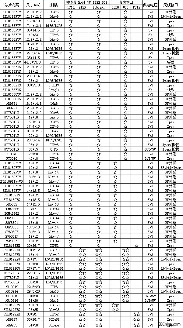 2.1:SDIO接口1T1R单通道的方案主要有:RTL8189系列、AR6302、88W8801、BCM43362、ESP8089、SV6030P、SP6051P;尺寸封装12*12mm/LGA-44和13.5*13/LGA-14以及14*12.5/LGA13为主;