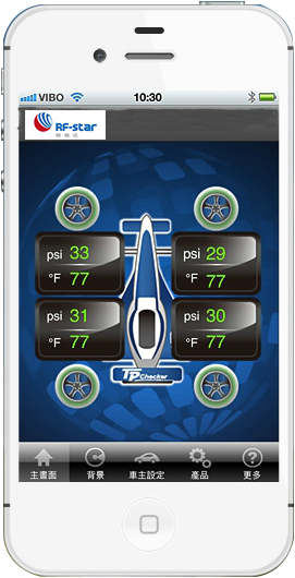 透过搭载蓝牙4.0功能的iPod5、iPhone4S/5或者iPad3/mini,掌握你爱车的状况,即便是行驶中,也可以随时监测,显示独立每一轮胎的压力、温度资讯.你只需要拿起你的iPhone再搭配上嵌入蓝牙4.0通信模块的胎压监测器,在弹指之间,透过直觉式的界面设计,即可从容不迫的轻易的得知轮胎状况。