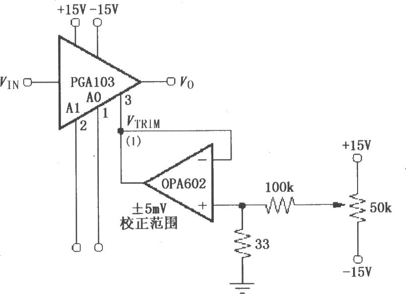 OPA602接成电压跟随器作为缓冲器,利用电压跟随器输出阻抗低的特性,使校正电路以低阻与PGA103的③脚相连接,以保持放大器增益的精确度。调节50kΩ电位器可以使失调电压为零,这时输出电压Vo=G(VIN-VTRIM)。因为逻辑输入A0、A1是以③脚为基准的,所以OPA602输出的校准电压VTRIM会影响逻辑电压阈值,因此应使VTRIM<0.1V。