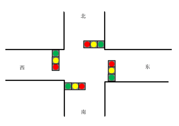 以一个最常见的十字路口为例,东西南北四个方向各有一组红绿灯。
