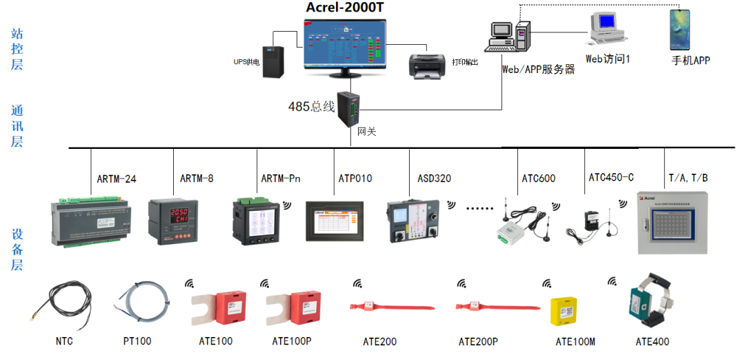 高压母排、电缆接头温度监测 应用场景 高压母排、电缆搭接处有接触电阻,当大电流通过时会产生热量,易导致设备烧毁或突然停电等事故。 从安全角度,推荐使用无线测温方案。采用ATE100/ATE400安装在母排、电缆搭接处,将采集到的温度数值,通过无线信号传输到ARTM-Pn显示端,可同时监测回路的电参量。 产品方案