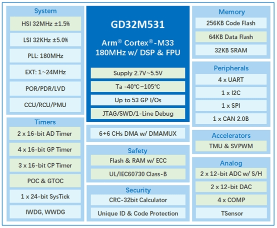 GD32M531系列的核心优势在于专为电机控制优化的硬件架构,从算力、控制精度到保护机制实现全维度升级: